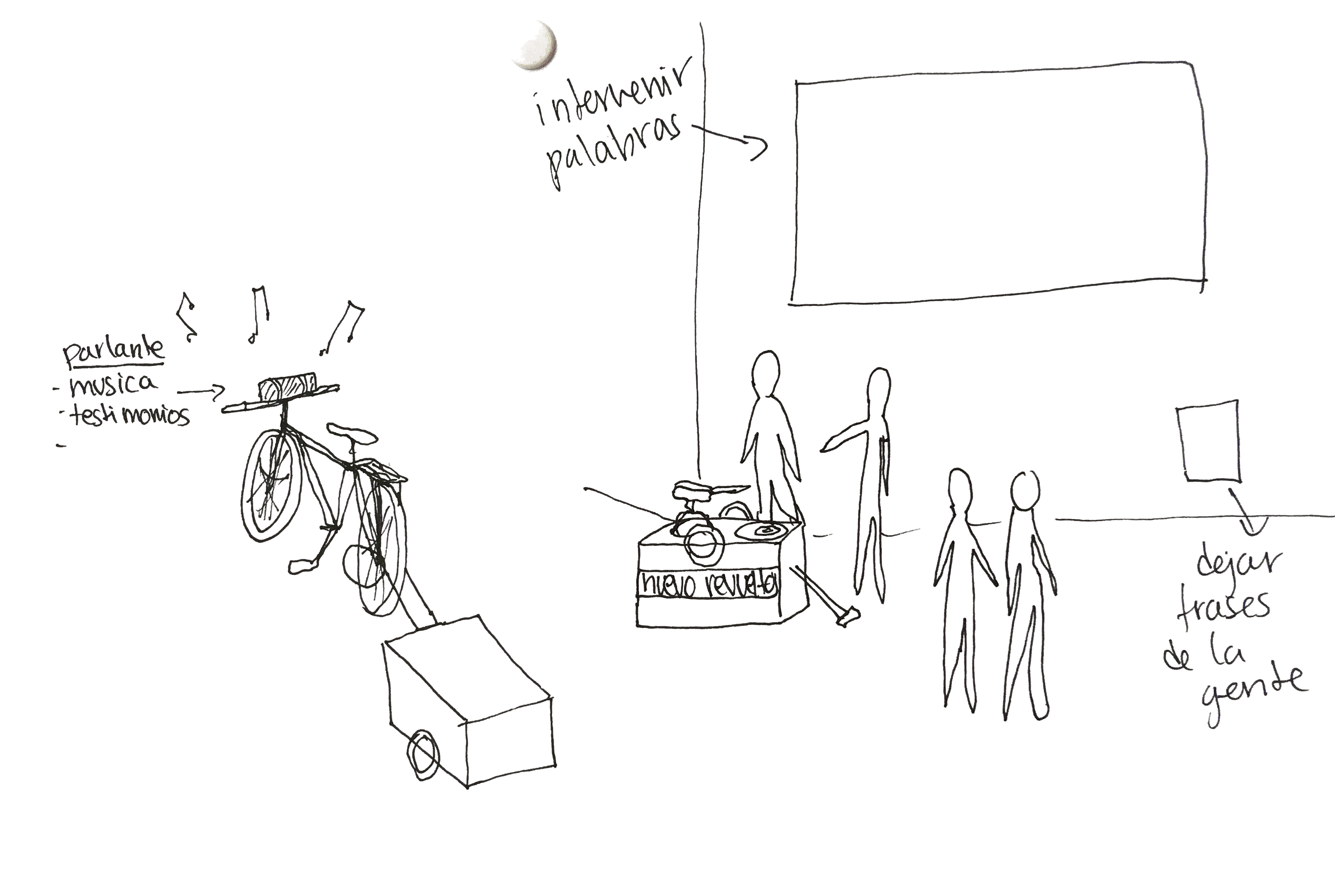 Los textos, poemas inspirado de los encuentros/lugares seran escrito in-situ para crear un mapeo de palabras. Las instalaciones de textos/palabras pueden quedar en algunos lugares o ir andando de forma performatica con la bicicleta para disparar nuevos relatos en relacion.